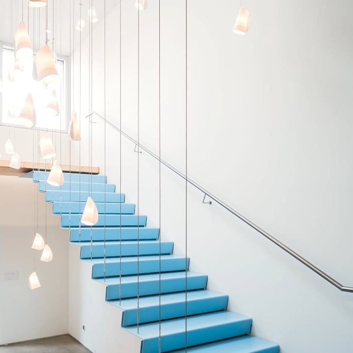 A sky-blue staircase makes an immediate impression at the entrance, rising toward a round skylight that fills the space with natural light. Nearby, a cluster of Bocci lights hangs overhead, casting a soft glow above a low sofa where team members and clients often gather. Just beyond, the long lunch table acts as the studio’s everyday hub—a place for casual chats, quick reviews and shared meals—underscoring Burnkit’s focus on bringing people together.