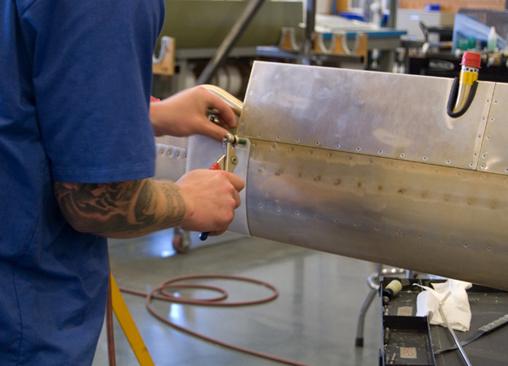 An assembly worker rivets wing struts for the Series 400 Twin Otter. Even with the most modern computer-aided manufacturing techniques, working with the thin sheets of aluminum that form the aircraft’s skin requires
