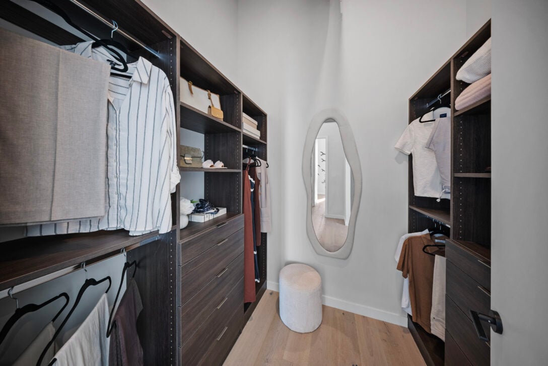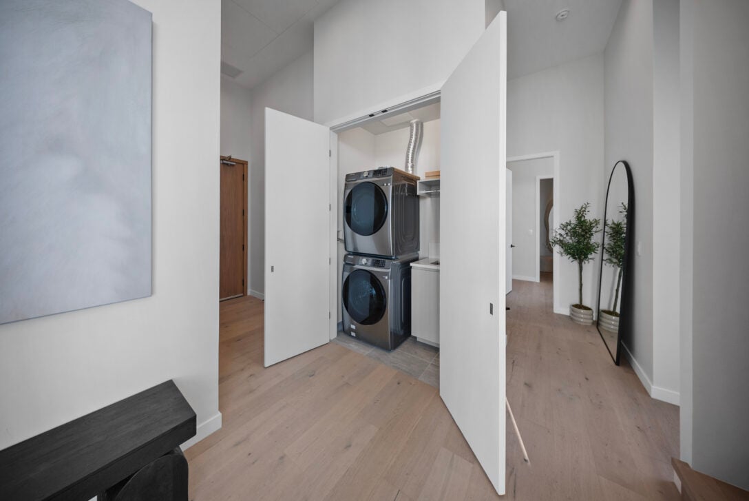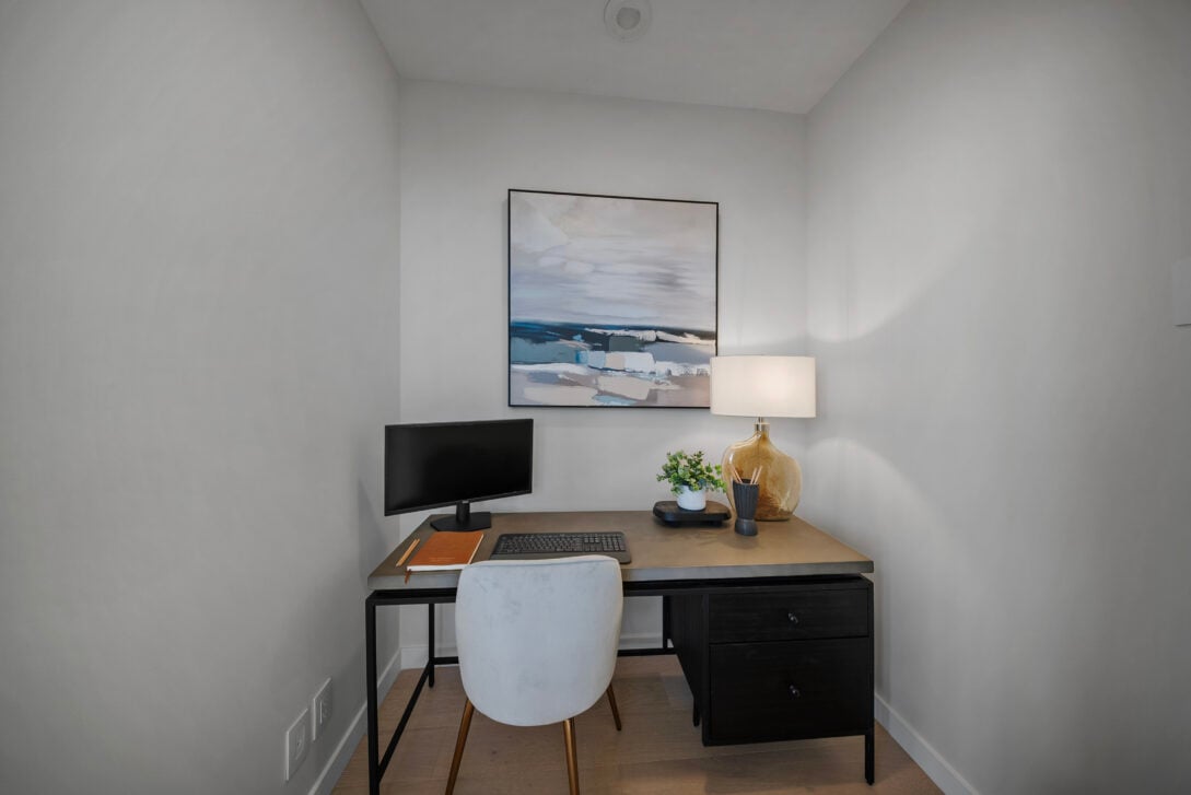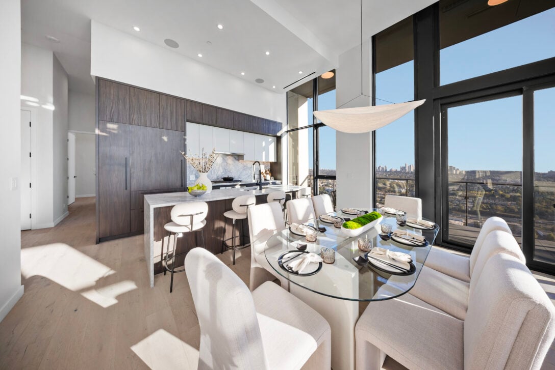The residence features soaring 14-foot ceilings, two bedrooms plus a den, integrated appliances, quartzite stone countertops and LED-lit cabinetry. Spa-inspired bathrooms include marble tiling, a frameless glass steam shower, soaker tub and heated floors.
