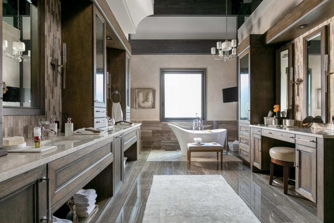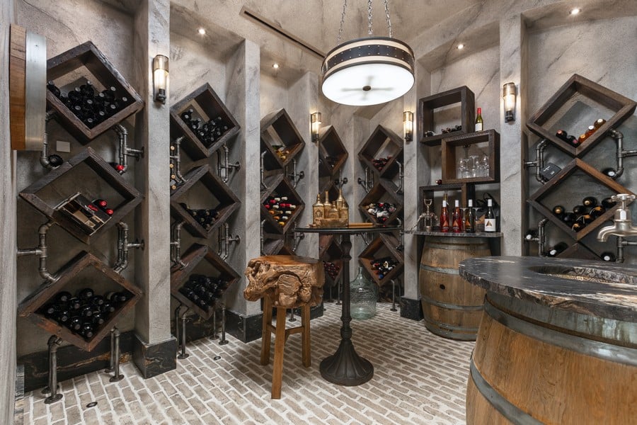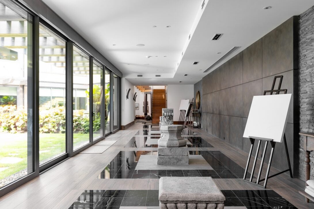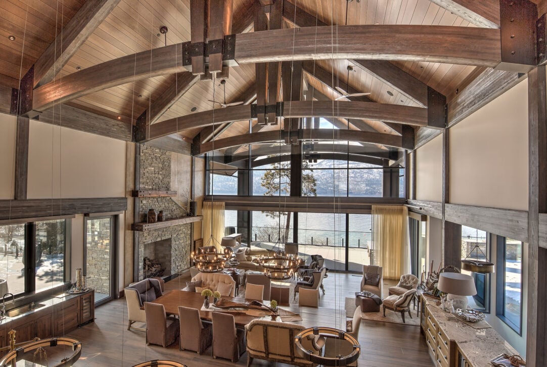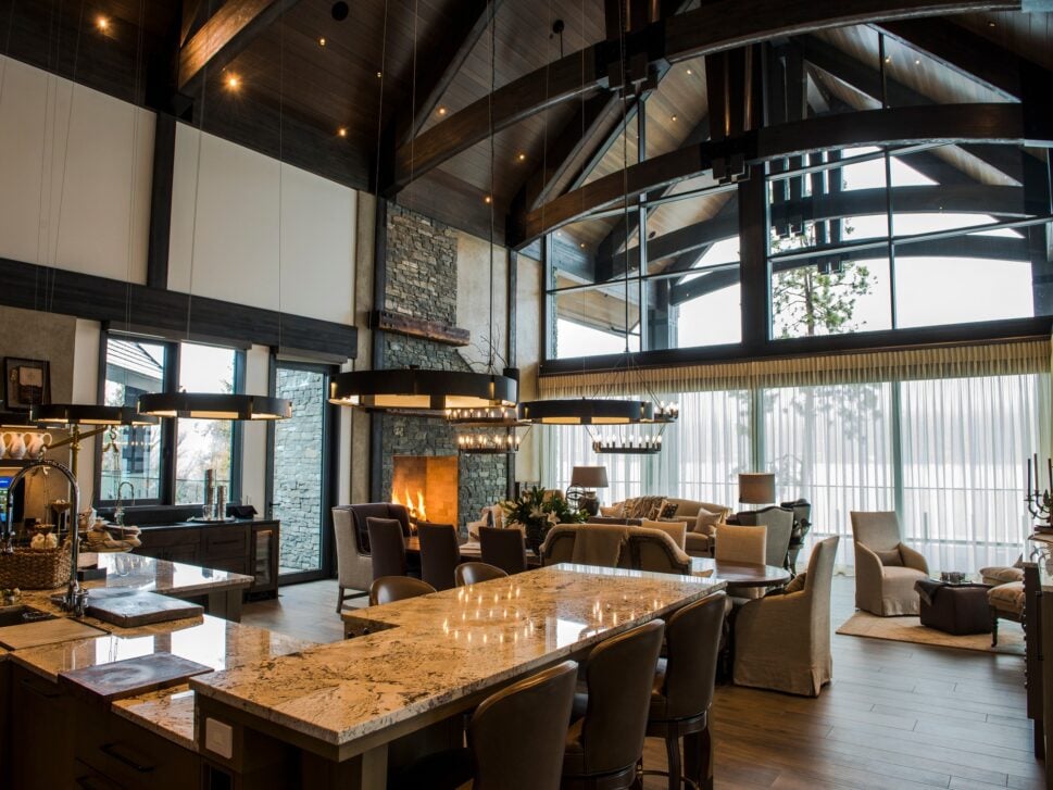 The property features vaulted wood-beam ceilings, marble-tiled corridors, wood-burning fireplaces, and panoramic lake and mountain views from nearly every room. The main wing includes a chef’s kitchen, theatre, wine cellar, home gym and recreation lounge with a full bar. Two primary suites anchor the residence, along with three additional ensuite bedrooms. A separate three-bedroom guest wing features its own kitchen and living area, while a detached 1,800-square-foot caretaker’s home rounds out the property.