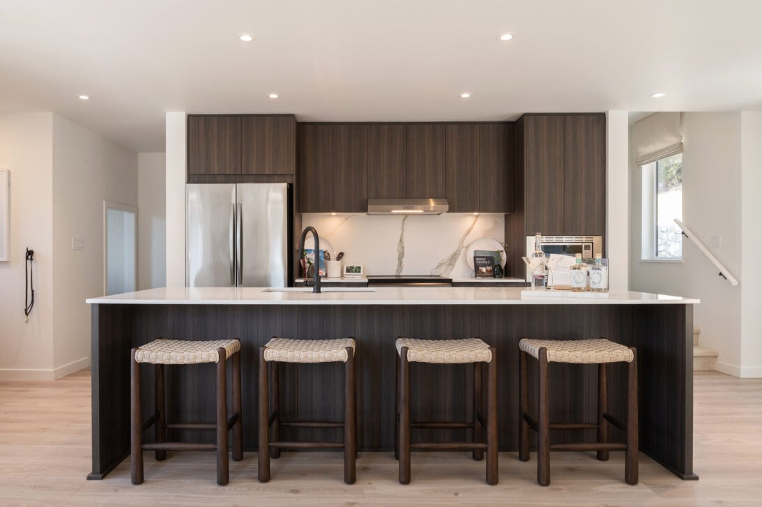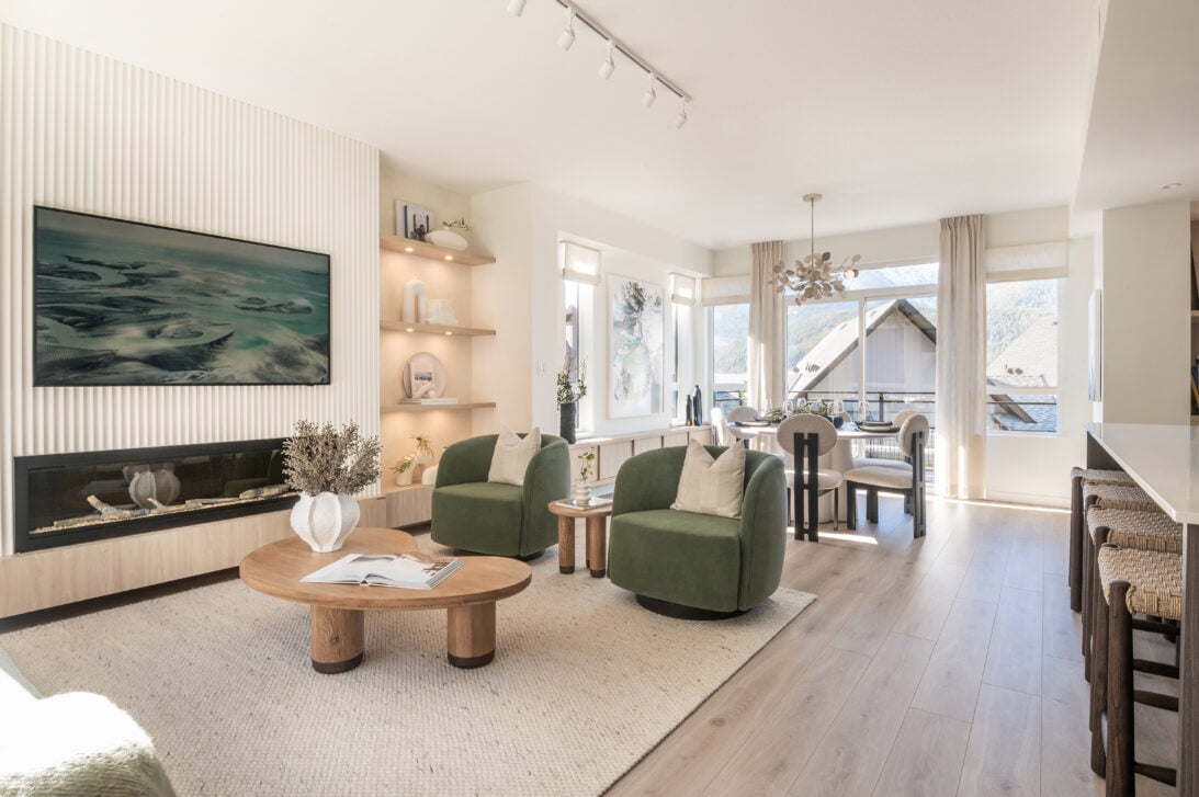 Terrain sits within Squamish’s Garibaldi Springs neighbourhood, positioned on a hillside overlooking the valley and close to parkland and trail networks. The three- and four-bedroom townhomes feature contemporary “mountain modern” elements such as pitched rooflines, black-framed windows and vertical siding. Interiors follow open-concept layouts with large kitchen islands, while heat pump systems provide heating and cooling. The homes also include overheight garages with EV rough-ins and storage space, reflecting the needs of buyers drawn to Squamish’s outdoor-oriented lifestyle.