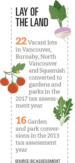 It’s been a banner year for conversions to gardens and parks, according to City of Vancouver data. For the 2017 tax roll, 15 properties were converted from class 6, or commercial, to class 8—community garden or public park use.