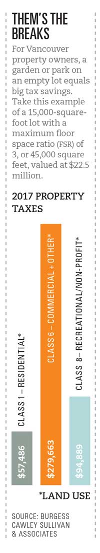 A big incentive for developers and landowners to convert empty commercial space into a community garden is the substantial tax break. “Properties just aren’t ready for development, and developers are seeing this as a way to lower cost,” says tax consultant Paul Sullivan, a principal at Vancouver-based commercial real estate appraisal firm Burgess Cawley Sullivan & Associates Ltd.