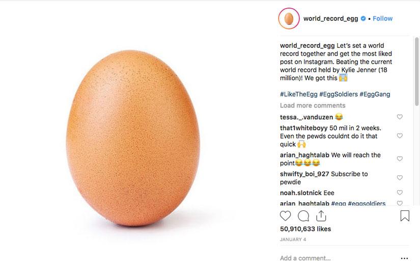 On January 4, 2019, an image was uploaded to Instagram by the account “@world_record_egg” with the caption “Let’s set a world record together and get the most liked post on Instagram. Beating the current world record held by Kylie Jenner (18 Million)! We got this [hands-raised emoji].” It then only took 10 days to reach 30.5 million likes and beat the standing record.