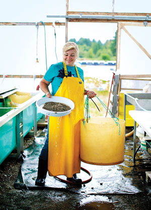He and his colleagues have even figured out a way to remove excess carbon dioxide from the seawater. “Increasingly we are seeing high mortality in the scallop hatchery due to ocean acidification, which affects the shell and growth of larvae,” Saunders explains. The more cabon dioxide is pumped into the ocean, the higher the acidity, and a lower pH balance spells more toxic algae. “Of course we can’t change the ocean’s pH balance, but we can control it in the hatchery,” he explains, likening this carbon-dioxide removal to furiously shaking a pop bottle then releasing the cap, degassing all the carbon dioxide. Saunders and other scientists are also working with several farmers in their struggle with the forces of nature—namely toxic blooms and increasingly acidic oceans—by breeding stronger brood stock and putting larger seed in the ocean.