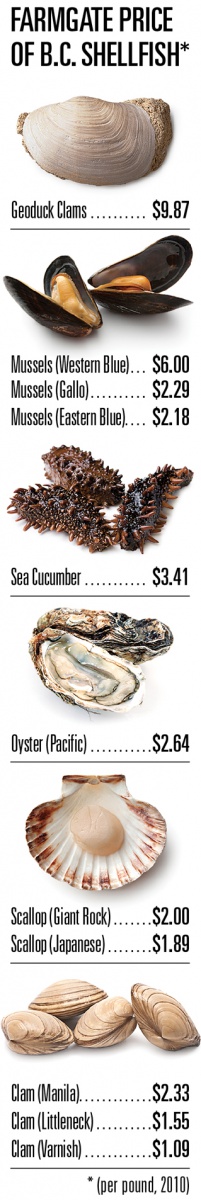 He explains that B.C. shellfish farmers can’t compete with cheap producers overseas because of our relatively high labour costs and our stringent regulatory controls, which stem at least partially from public controversy over farmed salmon. That makes the production of high-value seafood, such as the sea cucumber and geoduck, all the more important to the local shellfish industry.