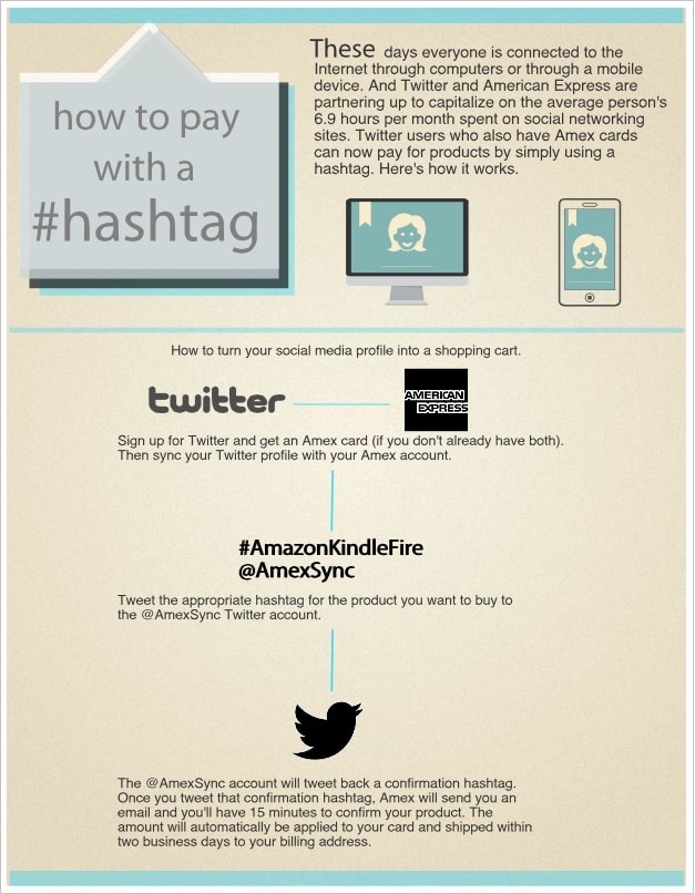 Because people spend an average of 6.9 hours per month on social networking sites, Twitter and American Express have announced a partnership that will allow Twitter users to buy products by simply tweeting the appropriate hashtag. The new service is available beginning Wednesday, Feb. 13, including offers for discounted products such as the Amazon Kindle Fire and the Song Action Cam.